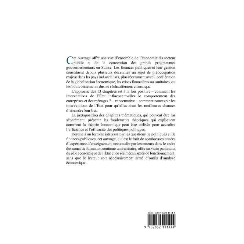 La juxtaposition des chapitres thématiques, qui peuvent être lus séparément, présente les fondements théoriques qui expliquent comment la théorie économique peut être utilisée pour accroître l’efficience et l’efficacité des politiques publiques. Destiné à un lectorat intéressé par les questions de politiques et de finances publiques, cet ouvrage, qui est le fruit de nombreuses années d’expérience d’enseignement accumulée par les auteurs dans le cadre des cours de formation continue universitaire, offre un vaste panorama du rôle économique de l’État et de ses mécanismes de fonctionnement, sans que le lecteur soit nécessairement armé d’outils d’analyse économique.