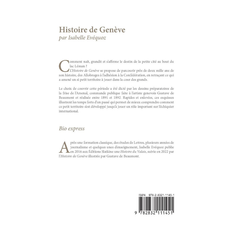 Après une formation classique, des études de Lettres, plusieurs années de journalisme et quelques unes d’enseignement, Isabelle Evéquoz publie en 2016 aux Éditions Slatkine une Histoire du Valais, suivie en 2022 par l’Histoire de Genève illustrée par Gustave de Beaumont.