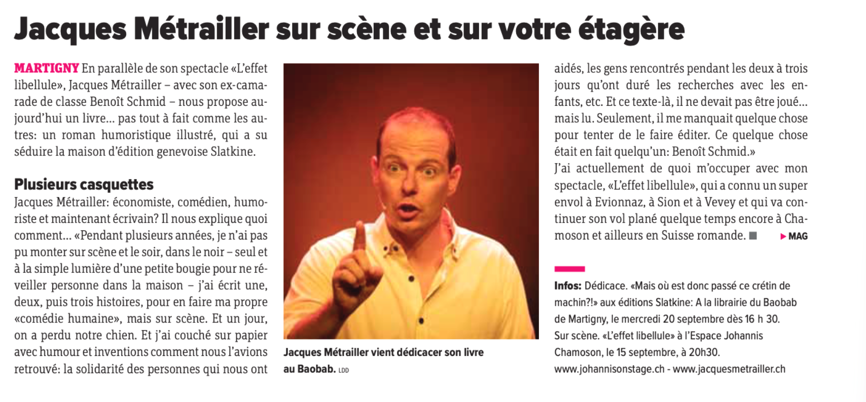 Jacques Métrailler et Benoît Schmid se sont rencontrés sur les bancs de l’École supérieure de commerce de Sion. C’était pas forcément bien parti pour la rigolade. L’un est devenu économiste et humoriste ; l’autre dessinateur et réalisateur. Ils se retrouvent aujourd’hui pour le joyeux fruit de leur collaboration, fruit 100% AOC Valais, que vous tenez entre vos délicates mimines.
