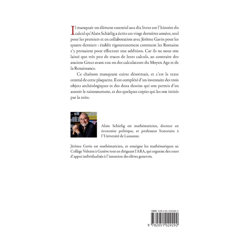 Il manquait un élément essentiel aux dix livres sur l’histoire du calcul qu’Alain Schärlig a écrits ces vingt dernières années, seul pour les premiers et en collaboration avec Jérôme Gavin pour les quatre derniers : établir rigoureusement comment les Romains s’y prenaient pour effectuer une addition. Car ils ne nous ont laissé que très peu de traces de leurs calculs, au contraire des anciens Grecs avant eux ou des calculateurs du Moyen Age et de la Renaissance.