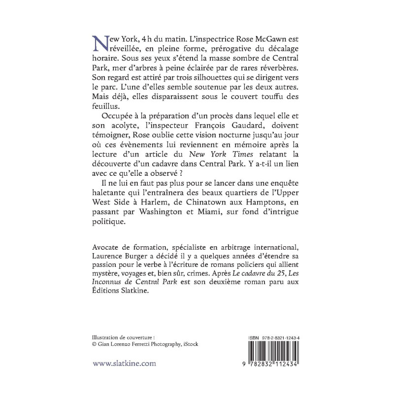 New York, 4h du matin. L’inspectrice Rose McGawn est réveillée, en pleine forme, prérogative du décalage horaire. Sous ses yeux s’étend la masse sombre de Central Park, mer d’arbres à peine éclairée par de rares réverbères. Son regard est attiré par trois silhouettes qui se dirigent vers le parc. L’une d’elles semble soutenue par les deux autres. Mais déjà, elles disparaissent sous le couvert touffu des feuillus.