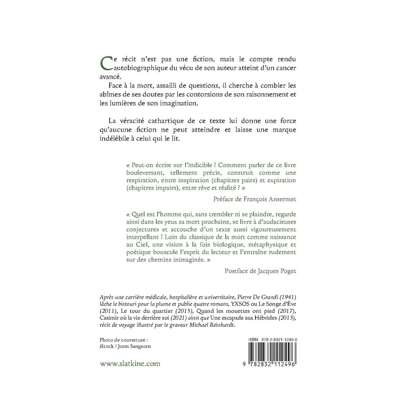 Ce récit n’est pas une fiction, mais le compte rendu autobiographique du vécu de son auteur atteint d’un cancer avancé.
