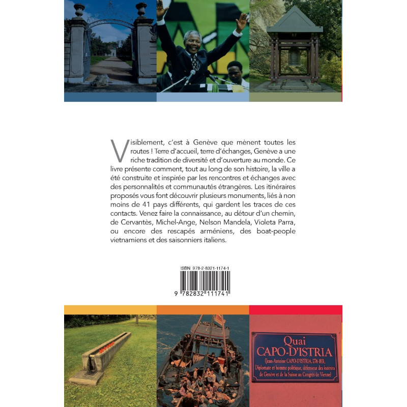 Visiblement, c’est à Genève que mènent toutes les routes ! Terre d’accueil, terre d’échanges, Genève a une riche tradition de diversité et d’ouverture au monde. Ce livre présente comment, tout au long de son histoire, la ville a été construite et inspirée par les rencontres et échanges avec des personnalités et communautés étrangères. Les itinéraires proposés vous font découvrir plusieurs monuments, liés à non moins de 41 pays différents, qui gardent les traces de ces contacts. Venez faire la connaissance, au détour d’un chemin, de Cervantès, Michel-Ange, Nelson Mandela, Violeta Parra, ou encore des rescapés arméniens, des boat-people vietnamiens et des saisonniers italiens.