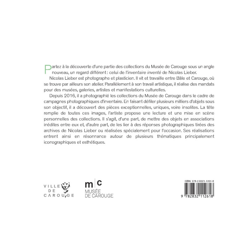 Nicolas Lieber est photographe et plasticien. Il vit et travaille entre Bâle et Carouge, où se trouve par ailleurs son atelier. Parallèlement à son travail artistique, il réalise des mandats pour des musées, galeries, artistes et manifestations culturelles. Depuis 2016, il a photographié les collections du Musée de Carouge dans le cadre de campagnes photographiques d’inventaire. En faisant défiler plusieurs milliers d’objets sous son objectif, il a découvert des pièces exceptionnelles, uniques, voire insolites. La tête remplie de toutes ces images, l’artiste propose une lecture et une mise en scène personnelles des collections. Il s’agit, d’une part, de mettre des objets en associations inédites entre eux et, d’autre part, de les lier à des réponses photographiques tirées des archives de Nicolas Lieber ou réalisées spécialement pour l’occasion. Ses réalisations entrent ainsi en résonnance autour de plusieurs thématiques principalement iconographiques et esthétiques.