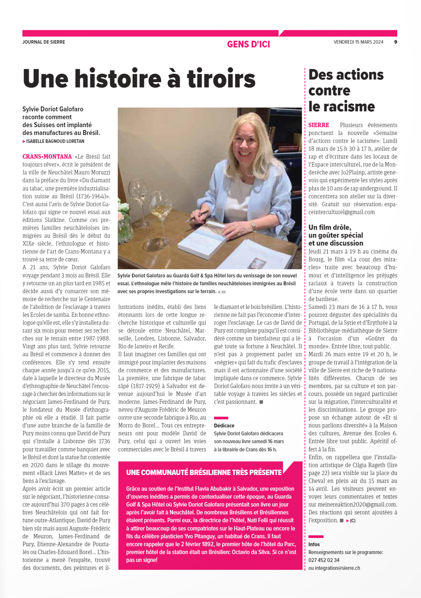 Sylvie Doriot Galofaro est historienne de l’art, historienne et ethnologue indépendante après avoir travaillé durant vingt-neuf ans comme enseignante au Cycle d’orientation de Crans-Montana et actuellement présidente de l’Université populaire dans ce même Centre scolaire. En 2006, elle fonde sa petite entreprise Art-Ethnovoyages.ch pour divulguer ses visites guidées, ses publications et voyages culturels. Parallèlement à son métier, elle commence une thèse de doctorat en 2008, sous la direction du professeur Philippe Kaenel à l’Université de Lausanne, soutenue en 2015 et publiée en 2017, Une histoire culturelle de Crans-Montana (1896-2016). Paysages, arts visuels, architecture, littérature et cinéma en Valais (Neuchâtel, éditions Alphil), commencée vingt ans après avoir défendu son mémoire en ethnologie sur les Écoles de samba à Rio et le Centenaire de l’Abolition de l’esclavage (1988). Aujourd’hui, présidente de l’association AEA Art-Ethno-Archi qu’elle a créée en 2021 pour mettre en valeur le patrimoine photographique relatif aux publications de ses livres et de sa thèse, entre autres. Avec cette nouvelle recherche sur le Brésil, elle renoue avec son objet d’étude comme étudiante à l’Institut d’ethnologie et au Musée d’ethnographie de Neuchâtel.