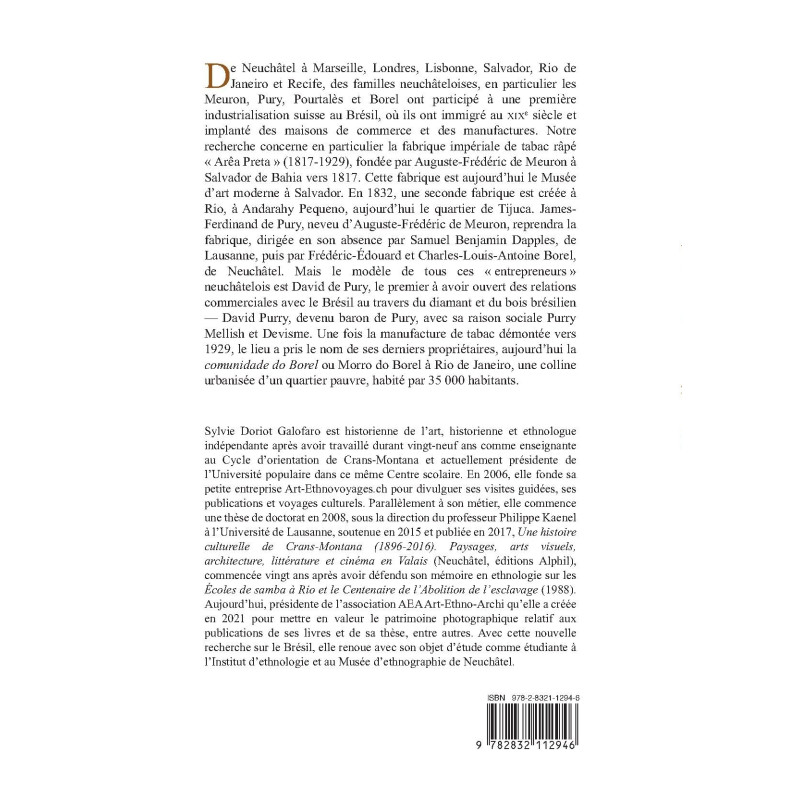 De Neuchâtel à Marseille, Londres, Lisbonne, Salvador, Rio de Janeiro et Recife, des familles neuchâteloises, en particulier les Meuron, Pury, Pourtalès et Borel ont participé à une première industrialisation suisse au Brésil, où ils ont immigré au XIXe siècle et implanté des maisons de commerce et des manufactures. Notre recherche concerne en particulier la fabrique impériale de tabac râpé « Arêa Preta » (1817-1929), fondée par Auguste-Frédéric de Meuron à Salvador de Bahia vers 1817. Cette fabrique est aujourd’hui le Musée d’art moderne à Salvador. En 1832, une seconde fabrique est créée à Rio, à Andarahy Pequeno, aujourd’hui le quartier de Tijuca. James-Ferdinand de Pury, neveu d’Auguste-Frédéric de Meuron, reprendra la fabrique, dirigée en son absence par Samuel Benjamin Dapples, de Lausanne, puis par Frédéric-Édouard et Charles-Louis-Antoine Borel, de Neuchâtel. Mais le modèle de tous ces «entrepreneurs» neuchâtelois est David de Pury, le premier à avoir ouvert des relations commerciales avec le Brésil au travers du diamant et du bois brésilien — David Purry, devenu baron de Pury, avec sa raison sociale Purry Mellish et Devisme. Une fois la manufacture de tabac démontée vers 1929, le lieu a pris le nom de ses derniers propriétaires, aujourd’hui la comunidade do Borel ou Morro do Borel à Rio de Janeiro, une colline urbanisée d’un quartier pauvre, habité par 35 000 habitants.