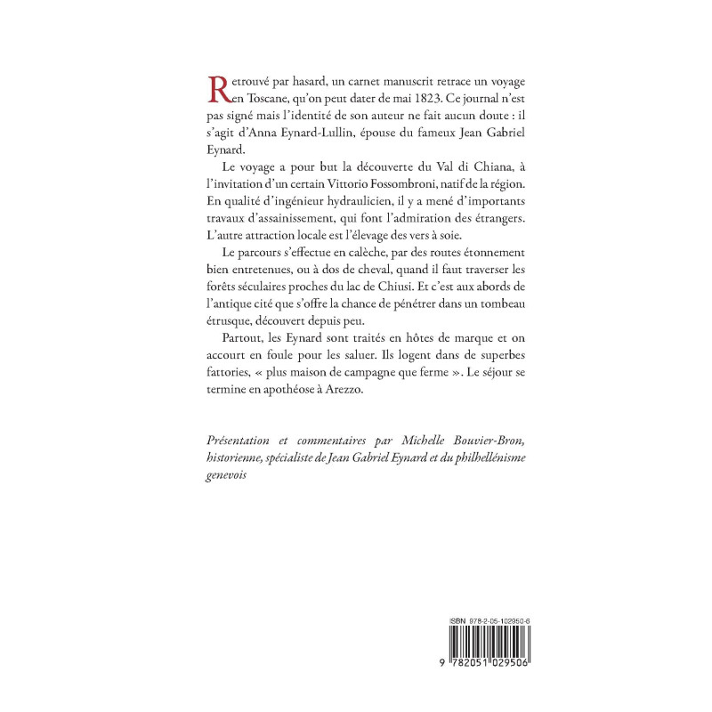 Retrouvé par hasard, un carnet manuscrit retrace un voyage en Toscane, qu’on peut dater de mai 1823. Ce journal n’est pas signé mais l’identité de son auteur ne fait aucun doute : il s’agit d’Anna Eynard-Lullin, épouse du fameux Jean Gabriel Eynard.