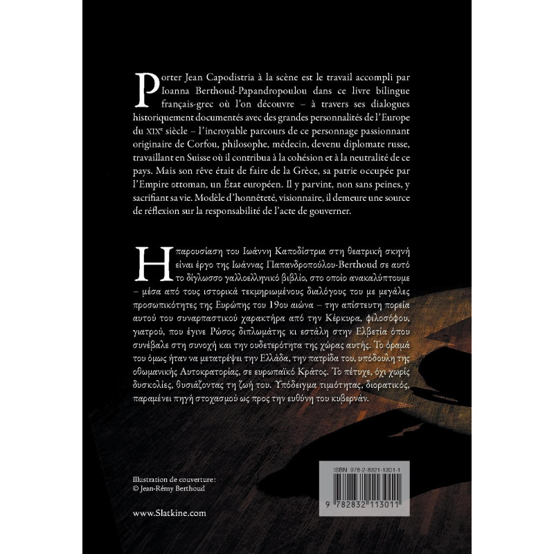 Porter Jean Capodistria à la scène est le travail accompli par Ioanna Berthoud-Papandropoulou dans ce livre bilingue français-grec où l’on découvre – à travers ses dialogues historiquement documentés avec des grandes personnalités de l’Europe du XIXe siècle – l’incroyable parcours de ce personnage passionnant originaire de Corfou, philosophe, médecin, devenu diplomate russe, travaillant en Suisse où il contribua à la cohésion et à la neutralité de ce pays. Mais son rêve était de faire de la Grèce, sa patrie occupée par l’Empire οttoman, un État européen. Il y parvint, non sans peines, y sacrifiant sa vie. Modèle d’honnêteté, visionnaire, il demeure une source de réflexion sur la responsabilité de l’acte de gouverner.