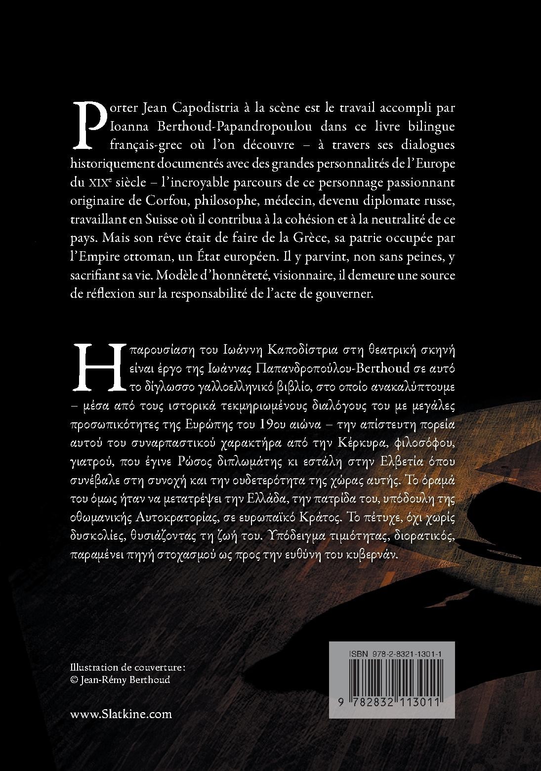 Η παρουσίαση του Ιωάννη Καποδίστρια στη θεατρική σκηνή είναι έργο της Ιωάννας Παπανδροπούλου-Berthoud σε αυτό το δίγλωσσο γαλλοελληνικό βιβλίο, στο οποίο ανακαλύπτουμε – μέσα από τους ιστορικά τεκμηριωμένους διαλόγους του με μεγάλες προσωπικότητες της Ευρώπης του 19ου αιώνα – την απίστευτη πορεία αυτού του συναρπαστικού χαρακτήρα από την Κέρκυρα, φιλοσόφου, γιατρού, που έγινε Ρώσος διπλωμάτης κι εστάλη στην Ελβετία όπου συνέβαλε στη συνοχή και την ουδετερότητα της χώρας αυτής. Το όραμά του όμως ήταν να μετατρέψει την Ελλάδα, την πατρίδα του, υπόδουλη της οθωμανικής Αυτοκρατορίας, σε ευρωπαϊκό Κράτος. Το πέτυχε, όχι χωρίς δυσκολίες, θυσιάζοντας τη ζωή του. Υπόδειγμα τιμιότητας, διορατικός, παραμένει πηγή στοχασμού ως προς την ευθύνη του κυβερνάν.