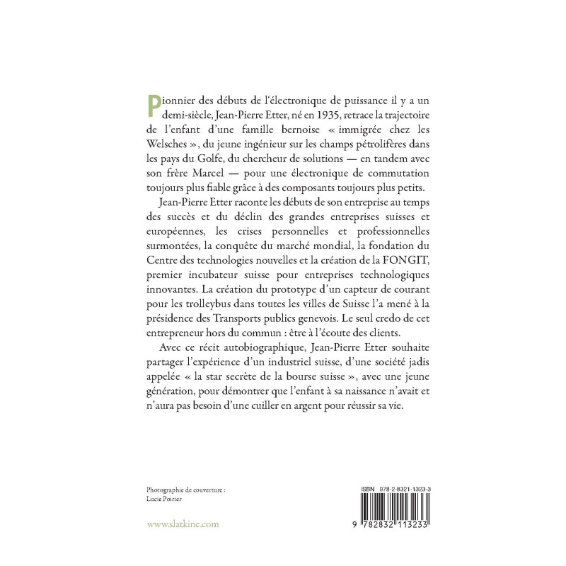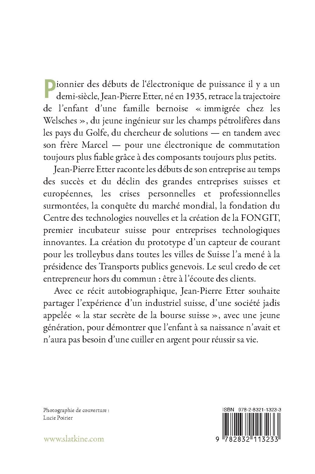 Jean-Pierre Etter raconte les débuts de son entreprise au temps des succès et du déclin des grandes entreprises suisses et européennes, les crises personnelles et professionnelles surmontées, la conquête du marché mondial, la fondation du Centre des technologies nouvelles et la création de la FONGIT, premier incubateur suisse pour entreprises technologiques innovantes. La création du prototype d’un capteur de courant pour les trolleybus dans toutes les villes de Suisse l’a mené à la présidence des Transports publics genevois. Le seul credo de cet entrepreneur hors du commun : être à l’écoute des clients.