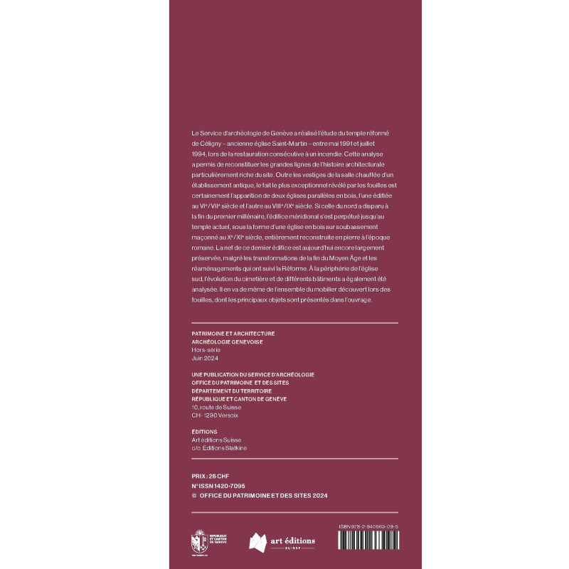 Le Service d’archéologie de Genève a réalisé l’étude du temple réformé de Céligny – ancienne église Saint-Martin – entre mai 1991 et juillet 1994, lors de la restauration consécutive à un incendie. Cette analyse a permis de reconstituer les grandes lignes de l’histoire architecturale particulièrement riche du site. Outre les vestiges de la salle chauffée d’un établissement antique, le fait le plus exceptionnel révélé par les fouilles est certainement l’apparition de deux églises parallèles en bois, l’une édifiée au VIe / VIIe siècle et l’autre au VIIIe / IXe siècle. Si celle du nord a disparu à la fin du premier millénaire, l’édifice méridional s’est perpétué jusqu’au temple actuel, sous la forme d’une église en bois sur soubassement maçonné au Xe / XIe siècle, entièrement reconstruite en pierre à l’époque romane. La nef de ce dernier édifice est aujourd’hui encore largement préservée, malgré les transformations de la fin du Moyen Âge et les réaménagements qui ont suivi la Réforme. À la périphérie de l’église sud, l’évolution du cimetière et de différents bâtiments a également été analysée. Il en va de même de l’ensemble du mobilier découvert lors des fouilles, dont les principaux objets sont présentés dans l’ouvrage.