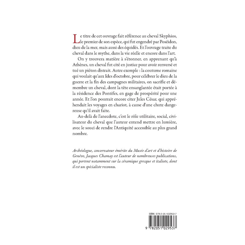 Le titre de cet ouvrage fait référence au cheval Skyphios, le premier de son espèce, qui fut engendré par Poséidon, dieu de la mer, mais aussi des équidés. Et l’ouvrage traite du cheval dans le mythe, dans la vie réelle et encore dans l’art. On y trouvera matière à s’étonner, en apprenant qu’à Athènes, un cheval fut cité en justice pour avoir renversé et tué un piéton distrait. Autre exemple : la coutume romaine qui voulait qu’aux Ides d’octobre, pour célébrer le dieu de la guerre et la fin des campagnes militaires, on sacrifie et démembre un cheval, dont la tête ensanglantée était portée à la résidence des Pontifes, en gage de prospérité pour une année. Et l’on pourrait encore citer Jules César, qui appréhendait les voyages en chariot, à cause d’une chute dangereuse qu’il avait faite.