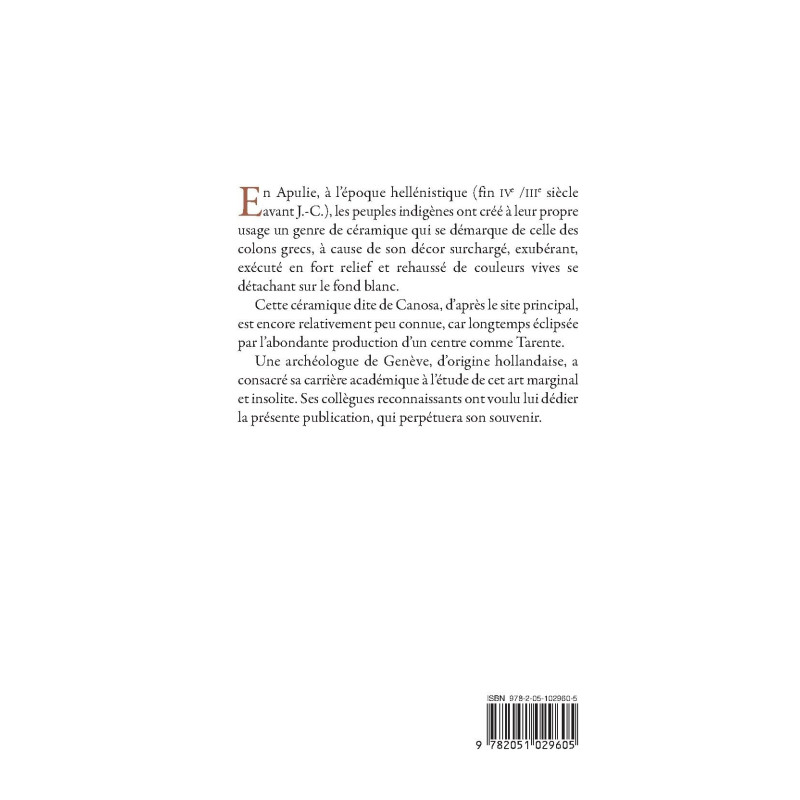 Cette céramique dite de Canosa, d’après le site principal, est encore relativement peu connue, car longtemps éclipsée par l’abondante production d’un centre comme Tarente.