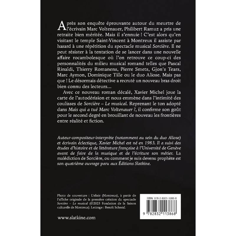Après son enquête éprouvante autour du meurtre de l’écrivain Marc Voltenauer, Philibert Ramuz a pris une retraite bien méritée. Mais il s’ennuie ! C’est alors qu’en visitant le temple Saint-Vincent à Montreux il assiste par hasard à une répétition du spectacle musical Sorcière. Il ne peut résister à la tentation de se lancer dans une nouvelle affaire rocambolesque où l’on retrouve ce coup-ci des personnalités du milieu musical romand telles que Pascal Rinaldi, Thierry Romanens, Pierre Smets, Gjon's Tears, Marc Aymon, Dominique Tille ou le duo Aliose. Mais pas que ! Le désormais détective a recruté un nouveau bras droit bien connu des lecteurs…