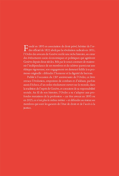 Publié à l’occasion du 130e anniversaire de l’Ordre, ce livre retrace l’évolution, empreinte de combats et d’idéaux, parfois aussi d’échecs, d’un barreau résolument ouvert sur le monde, dans la tradition de l’esprit de Genève, et conscient de sa responsabilité sociale. Au fil de son histoire, l’Ordre a su s’adapter aux profondes mutations de la profession, car être avocat en 1895 ou en 2025 ce n’est plus le même métier. Mais aujourd’hui comme hier, il continue de soutenir ses membres afin que ceux-ci, garants de l’état de droit, assurent aux justiciables un accès effectif à la justice et au droit.