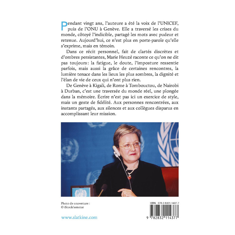Pendant vingt ans, l’auteure a été la voix de l’UNICEF, puis de l’ONU à Genève. Elle a traversé les crises du monde, côtoyé l’indicible, partagé les mots avec pudeur et retenue. Aujourd’hui, ce n’est plus en porte-parole qu’elle s’exprime, mais en témoin.