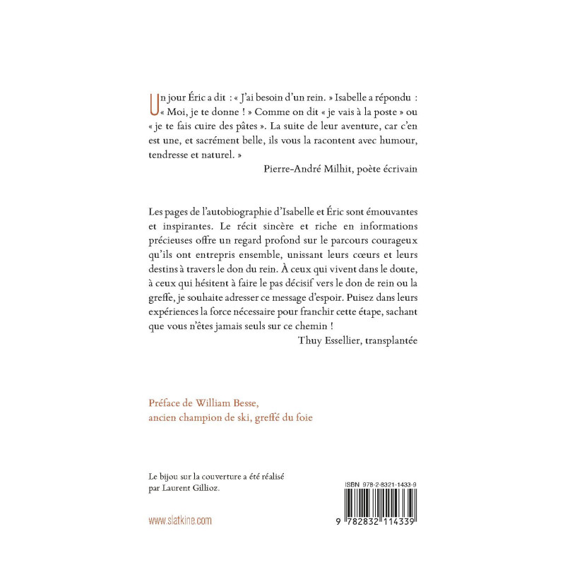Les pages de l’autobiographie d’Isabelle et Éric sont émouvantes et inspirantes. Le récit sincère et riche en informations précieuses offre un regard profond sur le parcours courageux qu’ils ont entrepris ensemble, unissant leurs cœurs et leurs destins à travers le don du rein. À ceux qui vivent dans le doute, à ceux qui hésitent à faire le pas décisif vers le don de rein ou la greffe, je souhaite adresser ce message d’espoir. Puisez dans leurs expériences la force nécessaire pour franchir cette étape, sachant que vous n’êtes jamais seuls sur ce chemin !