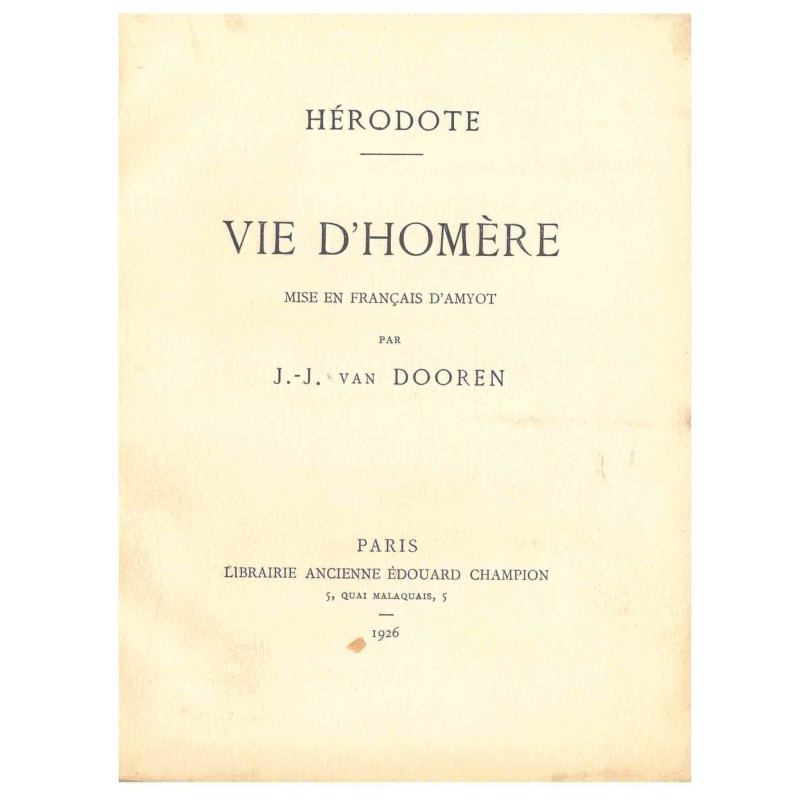« Ce petit livre ne s’adresse pas seulement aux hellénistes, mais à un public plus étendu, aimant les naïves légendes et les contes anciens. La vie d’Homère qu’on va lire est généralement attribué à Hérodote. Bien qu’écrite en ionien, elle semble cependant l’œuvre de quelque pasticheur postérieur, peut-être – comme le suppose Thomas W. Allen – d’Ephore, citoyen de Cume. Elle est en tout cas l’œuvre d’un écrivain parfaitement au courant des coutumes et du parler ioniens. Sept villes grecques se disputaient l’honneur d’avoir été la patrie d’Homère. L’auteur de cette biographie semble originaire de Smyrne, car tout le travail pourrait n’être qu’une glorification indirecte de ce grand port ionien. Pour conserver à l’œuvrette son caractère naïf et archaïque, et puisque l’original nous est gardé en ionien pastiche, nous avons voulu la présenter aux lecteurs français dans une langue que nous avons essayé de rapprocher autant que possible de celle dans laquelle Amyot a traduit les vies illustres de Plutarque. Peut-être nos lecteurs voudront-ils trouver quelque intérêt à cette « Vie d’Homère » que nous avons eu nous-même une grande joie à traduire. »