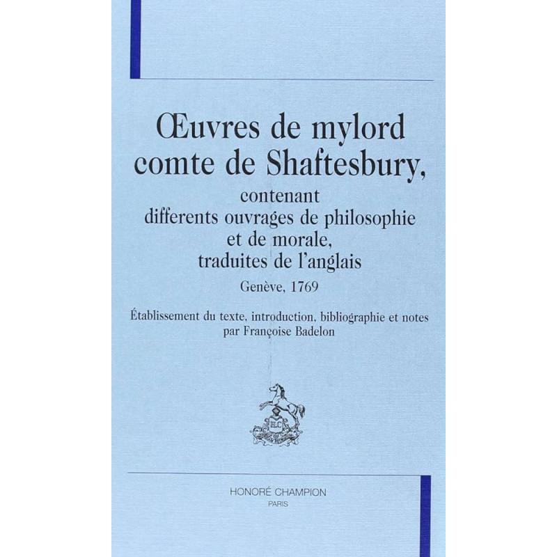 A travers les Œuvres de Mylord Shaftesbury (1671-1713), on peut découvrir un siècle de philosophie: le philosophe anglais, tout d'abord, dont la rhétorique subtile nous propose des stratégies de pensée et d'action, qui, sans être totalement inouïes, développent tout leur sens dans le geste qui présente aux passions un miroir capable de nous en faire sourire: psychiatrie morale, politique, esthétique et intellectuelle à appliquer au fanatisme, mais aussi à la mélancolie de l'écrivain, l'humour s'invente dans un sens bien particulier, comme contrôle des humeurs contraires au lien social. Le sens est également présent dans l'ordre des Traités des Characteristicks, restitué en fonction de l'édition originale anglaise de 1711, qui sollicite, dans sa mise en œuvre baroque, une correction indéfinie de l'écrivain par lui-même.