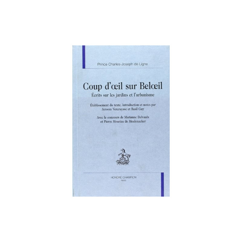 Le Coup d'œil sur Belœil et les principaux jardins de l'Europe est certes un ouvrage connu. Toutefois son édition critique faisait défaut. À ses 3 versions imprimées (1781, 1786, 1795) présentant chacune d'importantes modifications, l'on a joint une version inédite. Ces différents états textuels sont accompagnés de notes critiques sans oublier une introduction détaillée et un index explicatif étendu. Grand amateur de jardins, Ligne développe une doctrine qui rejette les décisions unilatérales ou irrémédiables. La " jardinomanie " outrancière de certains contemporains lui déplaît. Aménager la nature tout en la respectant. Le jardin, le parc, reflèteront le caractère de leurs propriétaires. Ils seront conçus pour y être heureux. Le Coup d'œil offre aussi le panorama des nombreux parcs et jardins européens. Cet aspect documentaire joint à l'hédonisme, sont présentés dans une langue claire, souvent teintée de l'humour d'un plaisant moraliste. Les éditeurs ont ajouté une dizaine d'écrits plus brefs sur les jardins : quelques-uns uns sont inédits, tous amplifient des propos du Coup d'œil. De plus, trois projets d'aménagement pour Paris et Vienne révèlent des vues d'un urbaniste soucieux de l'aspect et du plaisir de vivre dans un milieu agréable.