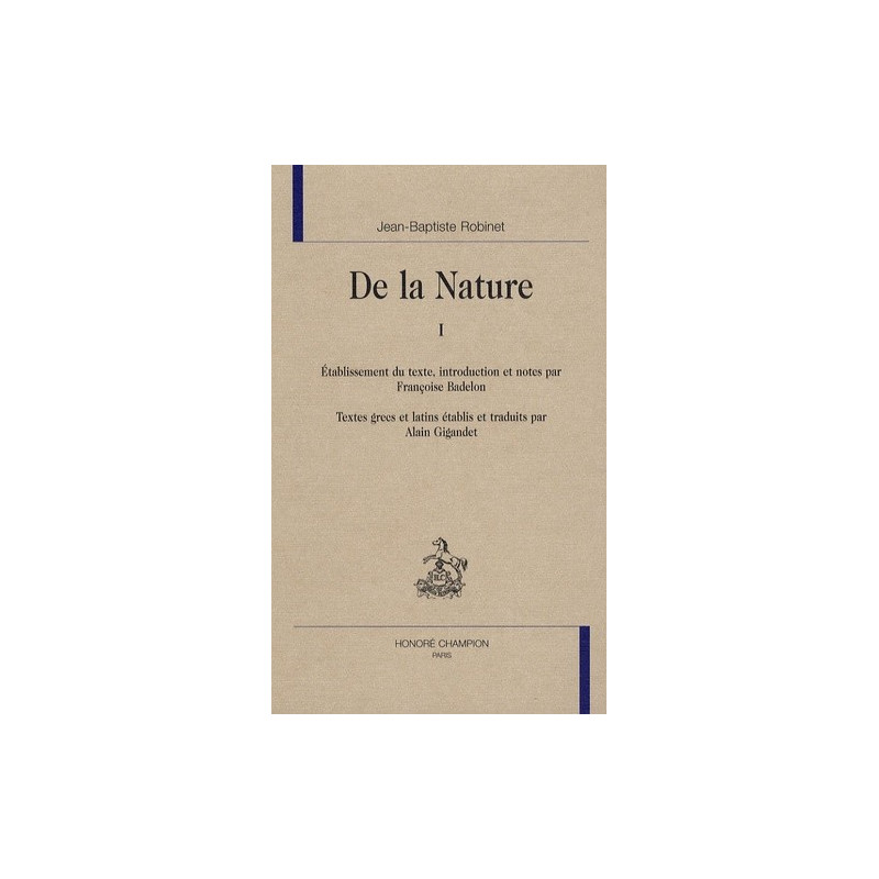 Jean-Baptiste Robinet, philosophe en partie éconduit par la postérité, publie à Amsterdam à partir de 1761, sous couvert de l'anonymat pour le premier tome, son ouvrage principal De la Nature, "livre capital" selon Hegel, représentatif de l'épistémè de l'âge classique selon Foucault. Cette œuvre qui est un morceau étonnant de philosophie hylozoïste, adossé aux découvertes récentes des naturalistes, est également une entrée privilégiée dans les Lumières européennes : positionné entre Voltaire sur la question du mal et Diderot dont il commente les Pensées sur l'interprétation de la nature, le philosophe rennais tente en outre d'arbitrer le débat sur " l'ordre des choses " entre nominalisme et essentialisme. Il entre également dans le cercle des rédacteurs des Suppléments de l'Encyclopédie. À ces titres divers il s'inscrit, à la fois comme éditeur et philosophe, dans une nouvelle manière de faire de la philosophie comme pratique raisonnée des dictionnaires et comptes rendus des sociétés savantes. Soucieux de ne laisser aucune question dans l'ombre, y compris quand elle est mêlée de religion, il assume une critique radicale de l'anthropomorphisme, appuyée sur le commentaire de Bayle, ce qui contribue à le situer durablement, entre athéisme et matérialisme, du côté des pensées inclassables.