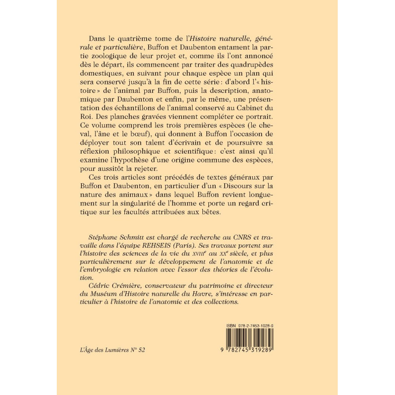 Dans le quatrième tome de l`Histoire naturelle, générale et particulière, Buffon et Daubenton entament la partie zoologique de leur projet et, comme ils l`ont annoncé dès le départ, ils commencent par traiter des quadrupèdes domestiques, en suivant pour chaque espèce un plan qui sera conservé jusqu`à la fin de cette série : d`abord l`"histoire " de l`animal par Buffon, puis la description, anatomique par Daubenton et enfin, par le même, une présentation des échantillons de l`animal conservé au Cabinet du Roi. Des planches gravées viennent compléter ce portrait. Ce volume comprend les trois premières espèces (le cheval, l`âne et le boeuf), qui donnent à Buffon l`occasion de déployer tout son talent d`écrivain et de poursuivre sa réflexion philosophique et scientifique : c`est ainsi qu`il examine l`hypothèse d`une origine commune des espèces, pour aussitôt la rejeter. Ces trois articles sont précédés de textes généraux par Buffon et Daubenton, en particulier d`un " Discours sur la nature des animaux " dans lequel Buffon revient longuement sur la singularité de l`homme et porte un regard critique sur les facultés attribuées aux bêtes.