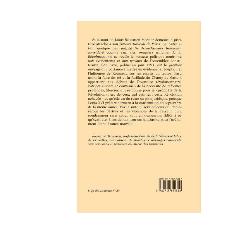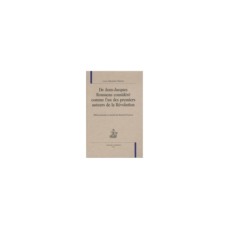 Si le nom de Louis-Sébastien Mercier demeure à juste titre attaché à son fameux Tableau de Paris, peut-être at-on quelque peu négligé De Jean-Jacques Rousseau considéré comme l'un des premiers auteurs de la Révolution, où se révèle le penseur politique confronté aux événements et aux travaux de l'Assemblée constituante. Son livre, publié en juin 1791, est le premier ouvrage d'importance à mettre en évidence la réception et l'influence de Rousseau sur les esprits du temps. Paru avant la fuite du roi et la fusillade du Champ-de-Mars, il appartient aux débuts de l'aventure révolutionnaire. Patriote sincère et convaincu de la nécessité de réformes profondes, Mercier, qui se donne pour le " prophète de la Révolution ", est de ceux qui estiment cette Révolution achevée - ce qu'elle est du reste au plan juridique, puisque Louis XVI prêtera serment à la constitution en septembre de la même année. Par la suite, il sera de ceux qui déploreront les dérives et les violences de la Terreur, qu'il condamnera sans appel, tout en demeurant fidèle à ce qu'avait été, à ses débuts, son enthousiasme pour l'avènement d'une France nouvelle.
