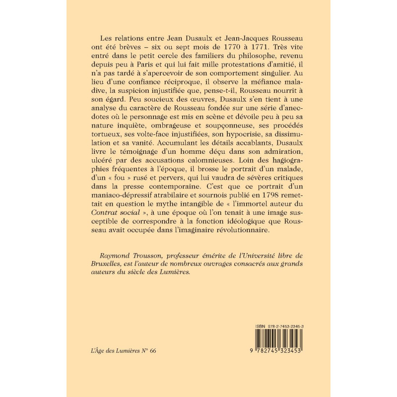 This study looks at Jean Dusaulx’s relation with Jean-Jacques Rousseau. It focuses in particular on Dusaulx’s views on Jean-Jacques Rousseau‘s character by depicting anecdotes of their brief encounter between 1770 and 1771. In his narrations, Dusaulx reveals Rousseau’s negative character traits by portraying an insane person. This image strongly contrasts with Rousseau as the immortal author of the Contrat social.