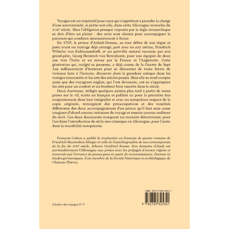 In 1766, the prince of Anhalt-Dessau undertook his obligatory Grand Tour with a close friend and a grand-nephew. The diaries kept by both while traveling through Italy, France and England are published here jointly and in full for the first time – shedding a revealing light on both their authors and their times.