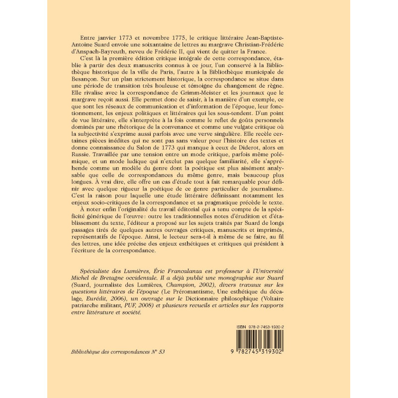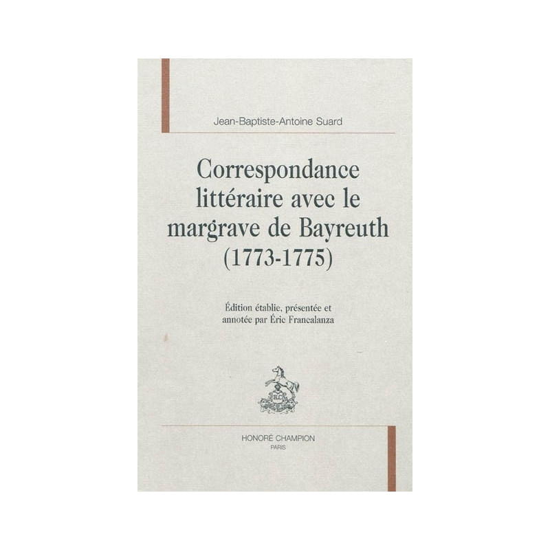 De 1773 à 1775, J.-B.-A. Suard envoie une soixantaine de lettres au margrave d'Anspach-Bayreuth, neveu de Frédéric II. es au margrave Christian-Frédéric d'Anspach-BayreuthC'est là la première édition critique intégrale de cette correspondance, établie à partir des deux manuscrits connus à ce jour, de la Bibliothèque historique de la ville de Paris et de la Bibliothèque municipale de Besançon. Travaillée par une tension entre mode critique et mode ludique, elle s'appréhende comme un modèle du genre. Afin disposer le lecteur à se faire, au fil des lettres, une idée précise des enjeux esthétiques et critiques qui président à l'écriture, l'éditeur a proposé, outre l'apparat critique traditionnel, des passages significatifs tirés de quelques autres ouvrages critiques, manuscrits et imprimés, représentatifs de l'époque.nctionnement, les enjeux politSpécialiste des Lumières, Éric Francalanza est maître de conférences à l'Université Michel de Montaigne-Bordeaux 3. Il a déjà publié une monographie sur Suard (Suard, journaliste des Lumières, Champion, 2002), divers travaux sur les questions littéraires de l'époque (Le Préromantisme. Une esthétique du décalage, Eurédit, 2006), un ouvrage sur le Dictionnaire philosophique (Voltaire patriarche militant, PUF, 2008) et plusieurs recueils et articles sur les rapports entre littérature et société.