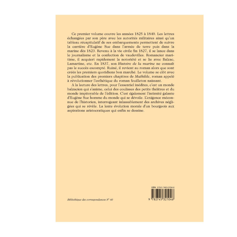 Ce premier volume couvre les années 1825 à 1840. Les lettres échangées par son père avec les autorités militaires ainsi qu`un tableau récapitulatif de ses embarquements permettent de suivre la carrière d`Eugène Sue dans l`armée de terre puis dans la marine dès 1823. Revenu à la vie civile fin 1827, il se lance dans le journalisme et la confection de vaudevilles. Romancier maritime, il acquiert rapidement la notoriété et se lie avec Balzac, Lamartine, etc. En 1837, son Histoire de la marine ne connaît pas le succès escompté. Ruiné, il revient au roman alors que sont créés les premiers quotidiens bon marché. Le volume se clôt avec la publication des premiers chapitres de Mathilde, roman appelé à révolutionner l`esthétique du roman feuilleton naissant. A la lecture des lettres, pour l`essentiel inédites, c`est un monde balzacien qui s`anime, celui des coulisses des petits théâtres et du monde impitoyable de l`édition. C`est également l`intimité galante d`Eugène Sue homme du monde qui se dévoile. L`exigence méconnue de l`historien, interrogeant inlassablement des archives négligées qui se révèle. La lente évolution morale d`un bourgeois aux aspirations aristocratiques qui enfin se dessine.