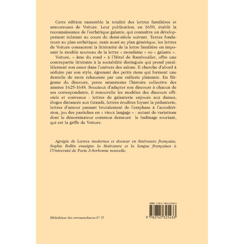Cette édition rassemble la totalité des lettres familières et amoureuses de Voiture. Leur publication, en 1650, établit la reconnaissance de l’esthétique galante, qui connaîtra un développement éclatant au cours du demi-siècle suivant. Textes fondateurs au plan esthétique, mais aussi au plan générique, les lettres de Voiture consacrent la littérarité de la lettre familière en imposant le modèle nouveau de la lettre « mondaine » ou « galante ».