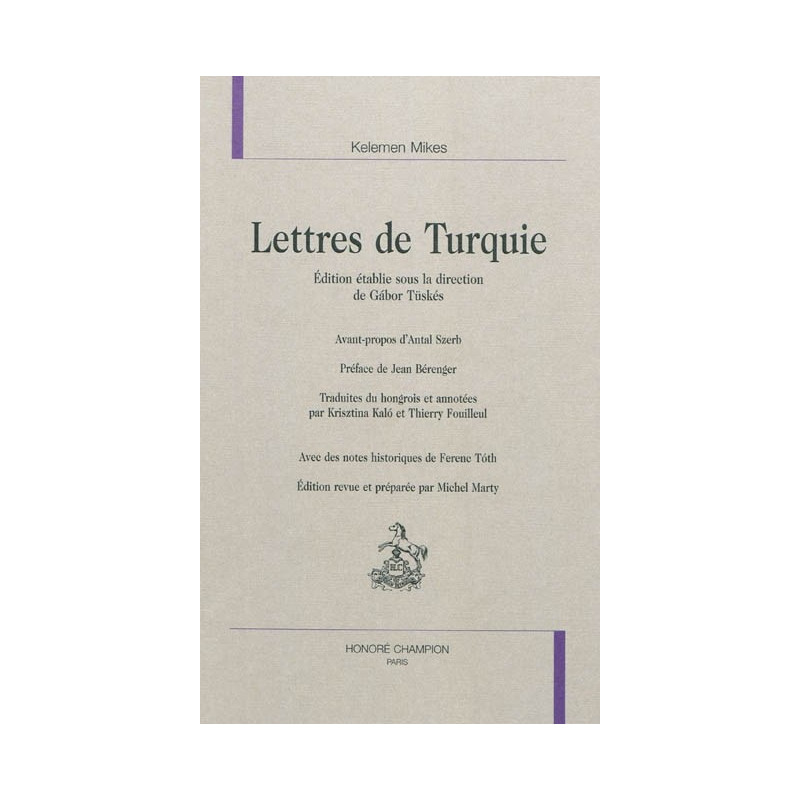 This is the first critical edition in French of the Letters from Turkey (1794) by Kelemen Mikes, a Hungarian political figure and essayist. The original letters are written in Hungarian and some passages in Transylvanian dialect. The letters can be considered as an important piece of Hungarian literature. They consist of memoirs from the everyday life, anecdotes, comments about the life of Hungarian immigrants in Turkey and descriptions of the Ottoman Empire.