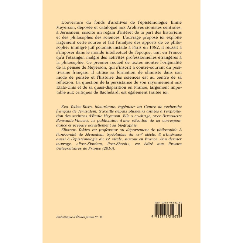 L'ouverture du fonds d'archives de l'épistémologue Émile Meyerson (1859-1933) suscite un regain d'intérêt de la part des historiens et des philosophes des sciences. Les Archives sionistes centrales, à Jérusalem, ont accueilli et catalogué tous les documents que la famille a déposés. Les champs disciplinaires sont vastes et variés, allant de l'histoire des Juifs d'Europe à la réception de la relativité. La correspondance avec les scientifiques et philosophes du monde entier, les manuscrits de ses œuvres ainsi que des inédits, scientifiques ou fantaisistes, sont des sources inestimables pour appréhender la tradition française d'histoire des sciences. L'exploitation de ce fonds donne lieu à une redécouverte de cet auteur. L'ouvrage proposé ici fait l'analyse d e sa place : immigré juif polonais installé à Paris en 1882, il réussit, dès la parution de son premier ouvrage, Identité et réalité (1908), à s'imposer dans le monde intellectuel de l'époque, tant en France qu'à l'étranger, malgré des activités professionnelles étrangères à la philosophie. Henri Bergson est de ceux qui participent de son rayonnement. Albert Einstein figure parmi s es correspondants. Ce premier recueil de textes montre l'originalité de la pensée de Meyerson, qui s'inscrit à contre-courant du positivisme français. Il le replace dans son contexte historique et traite de son passage de la chimie à la philosophie des sciences avant d'aborder sa philosophie et son impact, en France et à l'étranger, de son vivant et après sa mort. Meyerson utilise sa formation de chimiste dans son mode de pensée et l'histoire des sciences est au centre de sa réflexion. La question de la persistance de son rayonnement aux États-Unis et de sa quasi-disparition en France, largement imputable aux critiques de Bachelard, est également traitée ici.