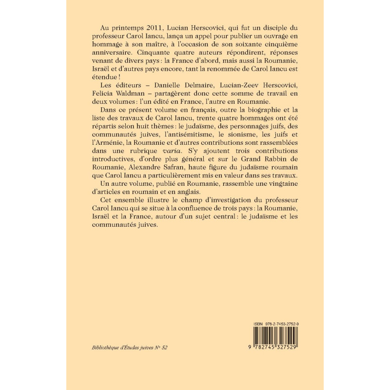 This volume is intended as an homage to Pr. Carol Iancu, on the occasion of his 65th birthday. 34 original contributions are grouped under 8 headings, illustrating the breadth of his research: Judaism, Jewish characters, Jewish communities, anti-Semitism, Zionism, Jews and Armenia, Romania, and varia.