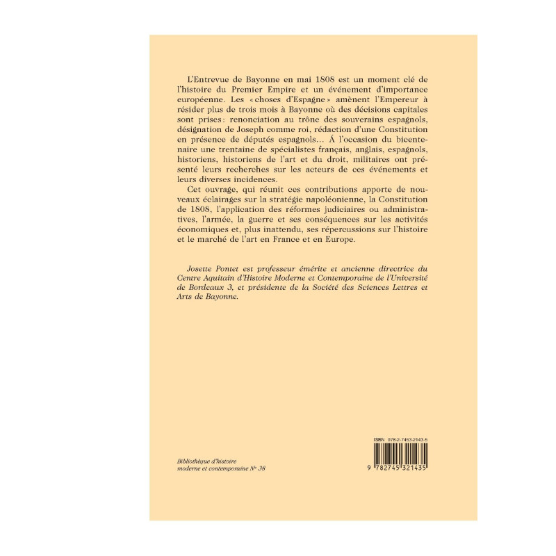 These proceeding papers deal with the royal charter of Bayonne 1808 which defines the intended basis of Napoleon’s rule as king of Spain. To celebrate the bicentennial of this charter, numerous specialists in the field have reunited to shed new light on topics like Napoleon’s strategy, the Constitution of 1808, juridical and administrative reforms, the army, the war and its consequence on economic activities as well as its influence on art and history in France and Europe.