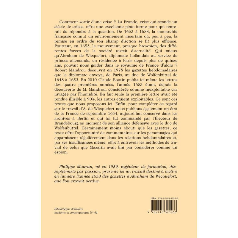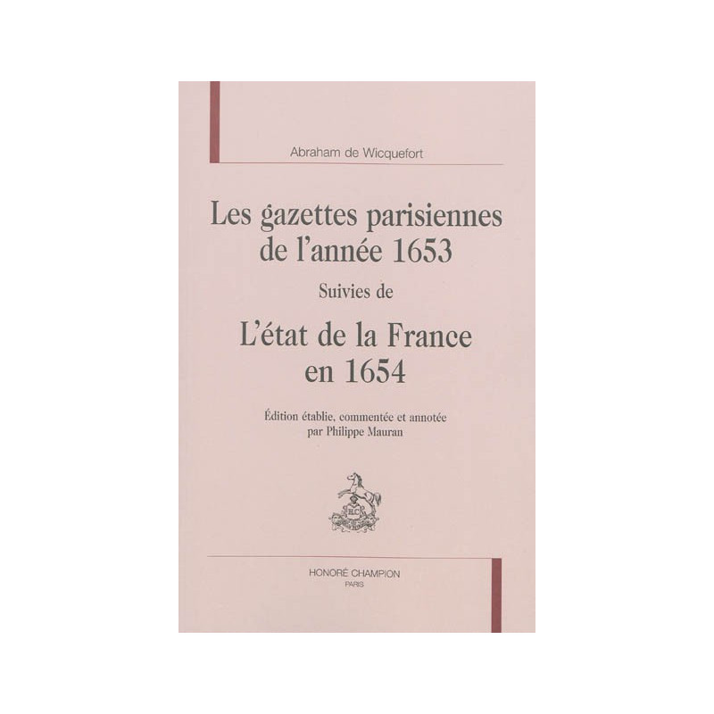 This book gathers the weekly dispatches (which were believed lost until now) prepared in the year 1653 by Abraham de Wicquefort, a Dutch diplomat residing in Paris. It also includes his account of France in September 1654, commissioned by the Elector of Brandenburg, which is revealing of his working methods.