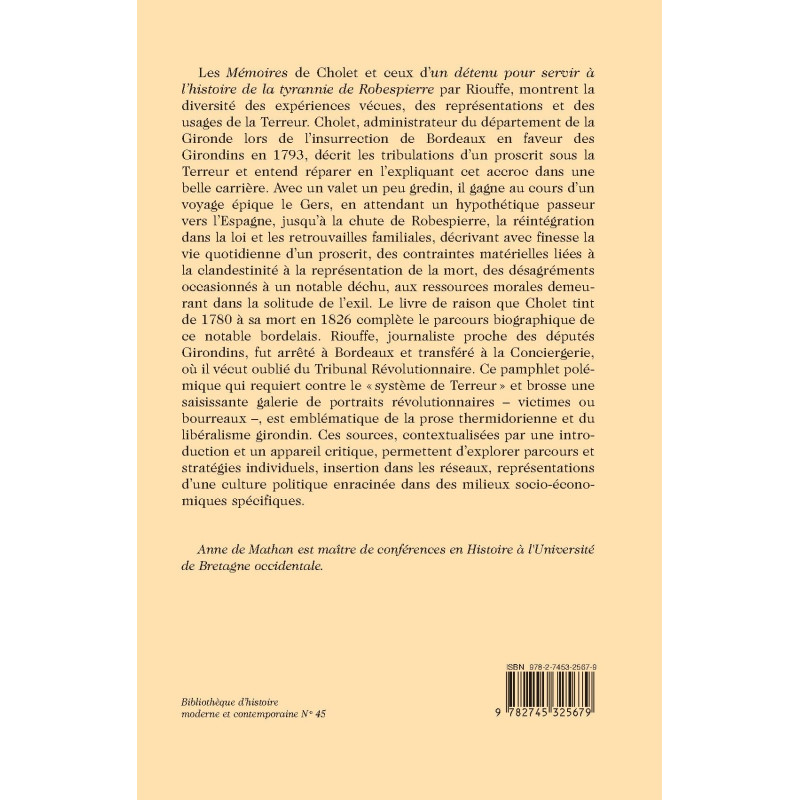 où il vécut oublié du Tribunal Révolutionnaire. Ce pamphlet polémique qui requiert contre le « système de Terreur » et brosse une saisissante galerie de portraits révolutionnaires – victimes ou bourreaux –, est emblématique de la prose thermidorienne et du libéralisme girondin. Ces sources, contextualisées par une introduction et un appareil critique, permettent d’explorer parcours et stratégies individuels, insertion dans les réseaux, représentations d’une culture politique enracinée dans des milieux socio-économiques