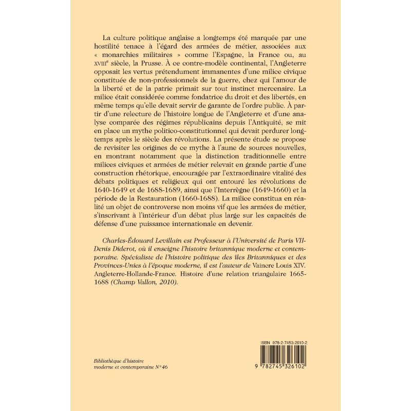 For a long time, English political culture was wary of professional armies (which were linked to the continent’s “military monarchies”) and favorable to militias (the very foundations of right and freedom). This inquiry into the origins of this myth shows that the difference between the two was largely rhetorical.