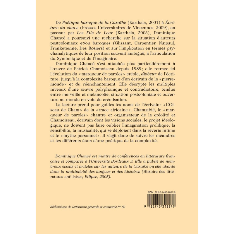 De Poétique baroque de la Caraïbe (Karthala, 2001) à Écriture du chaos (Presses Universitaires de Vincennes, 2008), en passant par Les Fils de Lear (Karthala, 2003), Dominique Chancé a poursuivi une recherche sur la situation d'auteurs postcoloniaux et/ou baroques (Glissant, Carpentier, Naipaul, Franketienne, Des Rosiers) et sur l'implication en termes psychanalytiques de leur position souvent ambiguë, à l'articulation du Symbolique et de l'Imaginaire. Dominique Chancé s'est attachée plus particulièrement à l'œuvre de Patrick Chamoiseau depuis 1989 ; elle retrace ici l'évolution du " marqueur de paroles " créole, djobeur de l'écriture, jusqu'à la complexité baroque d'un écrivain de la " pierre-monde " et du réenchantement. Elle décrypte les multiples niveaux d'une œuvre polyphonique et contradictoire, tendue entre merveille et mélancolie, situation postcoloniale et ouverture au monde en voie de créolisation. La lecture prend pour guides les noms de l'écrivain : " L'Oiseau de Cham " de la " trace africaine ", Chamzibié, le " marqueur de paroles " chantre et organisateur de la créolité et Chamoiseau, écrivain dont les visions sociales, le projet idéologique, ne doivent pas faire oublier l'imagination prolifique, la sensibilité, la musicalité, qui se déploient dans la rêverie intime et le " mythe personnel ". Il s'agit donc de suivre les méandres et les différents états d'une poétique de la complexité.
