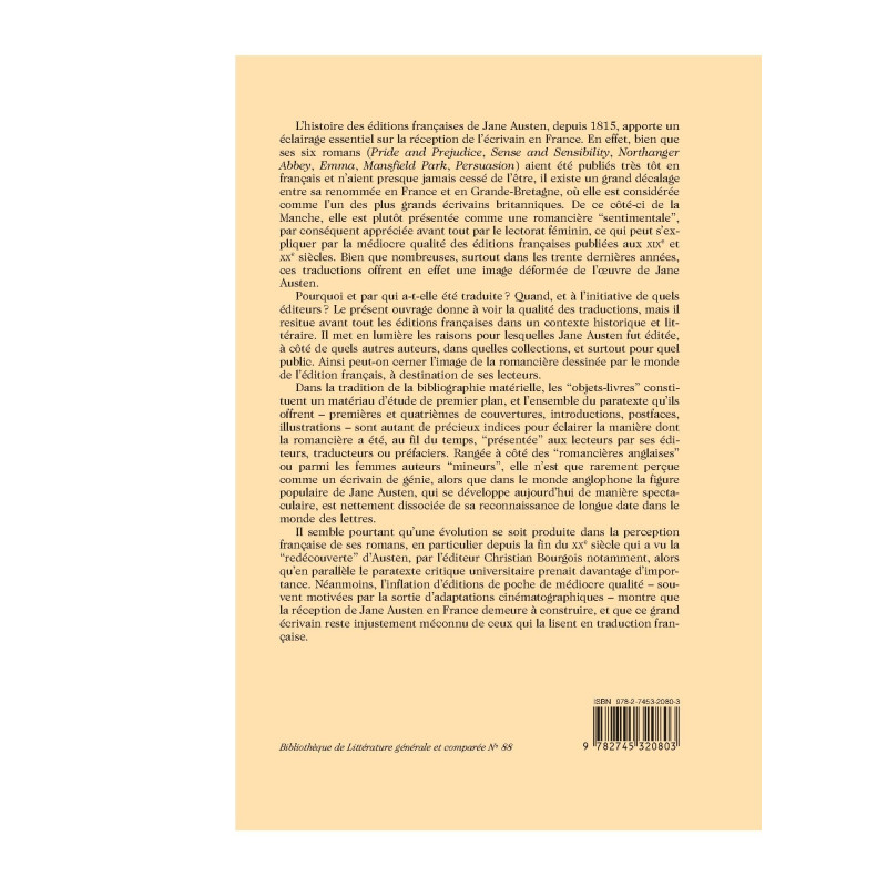 n, qui se développe aujourd'hui de manière spectaculaire, est nettement dissociée de sa reconnaissance de longue date dans le monde des lettres. Il semble pourtant qu'une évolution se soit produite dans la perception française de ses romans, en particulier depuis la fin du XXe siècle qui a vu la "redécouverte" d'Austen, par l'éditeur Christian Bourgois notamment, alors qu'en parallèle le paratexte critique universitaire prenait davantage d'importance. Néanmoins, l'inflation d'éditions de poche de médiocre qualité - souvent motivées par la sortie d'adaptations cinématographiques - montre que la réception de Jane Austen en France demeure à construire, et que ce grand écrivain reste injustement méconnu de ceux qui la lisent en traduction française.