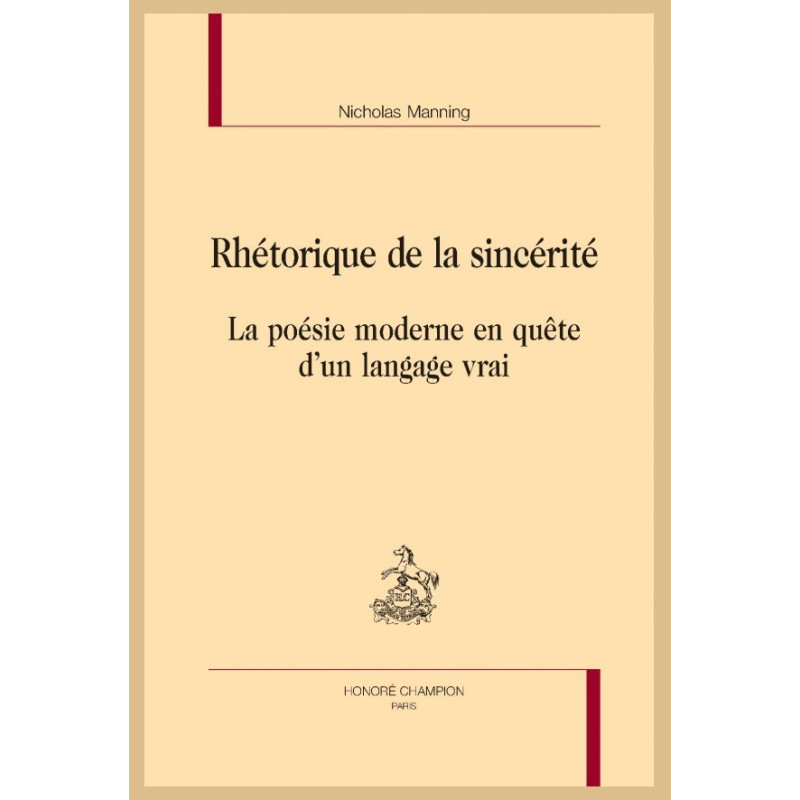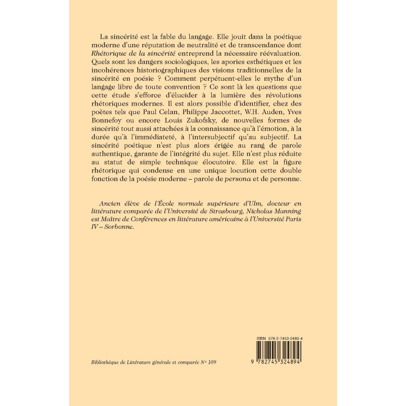 La sincérité est la fable du langage. Elle jouit dans la poétique moderne d’une réputation de neutralité et de transcendance dont « Rhétorique de la sincérité » entreprend la nécessaire réévaluation. Quels sont les dangers sociologiques, les apories esthétiques et les incohérences historiographiques des visions traditionnelles de la sincérité en poésie ? Comment perpétuent-elles le mythe d’un langage libre de toute convention ? Ce sont là les questions que cette étude s’efforce d’élucider à la lumière des révolutions rhétoriques modernes. Il est alors possible d’identifier, chez des poètes tels que Paul Celan, Philippe Jaccottet, W.H. Auden, Yves Bonnefoy ou encore Louis Zukofsky, de nouvelles formes de sincérité tout aussi attachées à la connaissance qu’à l’émotion, à la durée qu’à l’immédiateté, à l’intersubjectif qu’au subjectif. La sincérité poétique n’est plus alors érigée au rang de parole authentique, garante de l’intégrité du sujet. Elle n’est plus réduite au statut de simple technique élocutoire. Elle est la figure rhétorique qui condense en une unique locution cette double fonction de la poésie moderne – parole de « persona » et de personne.