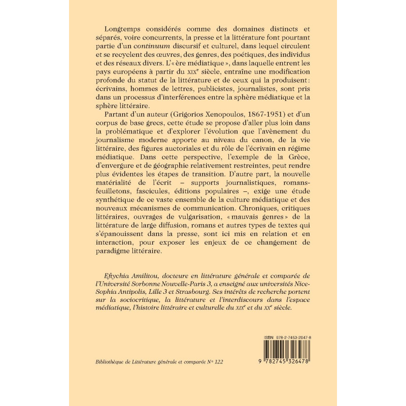 Based on the premise there is a discursive and cultural continuum between literature and the press, this study focuses on a Greek author, Grigorios Xenopoulos, and a Greek body of texts. It explores the evolutions of literary life, authorial figures and the role of the writer spurred by the advent of modern journalism.
