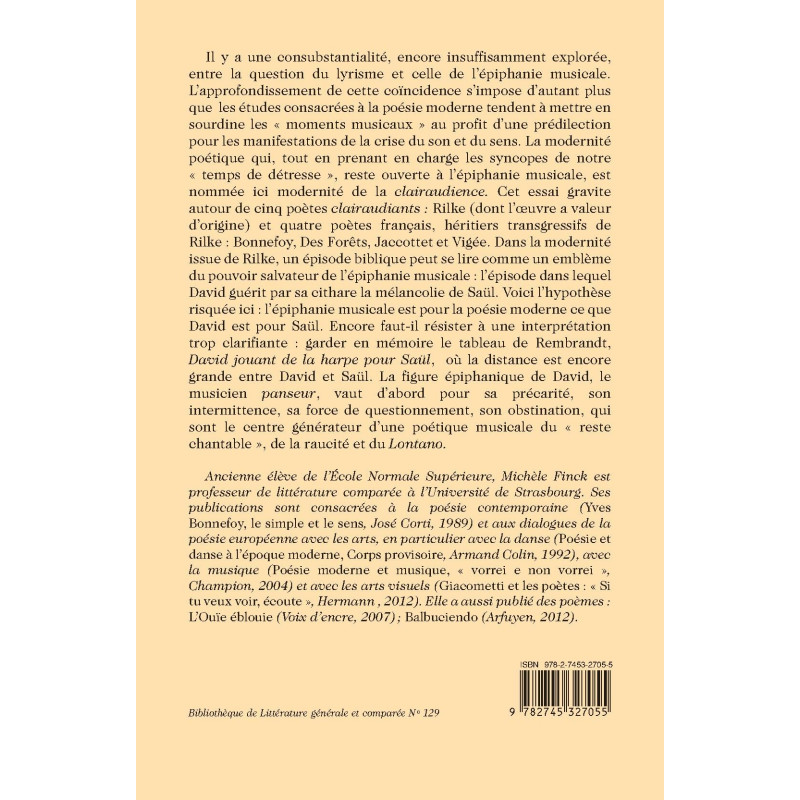 L’approfondissement de cette coïncidence s’impose d’autant plus que les études consacrées à la poésie moderne tendent à mettre en sourdine les « moments musicaux » au profit d’une prédilection pour les manifestations de la crise du son et du sens. La modernité poétique qui, tout en prenant en charge les syncopes de notre « temps de détresse », reste ouverte à l’épiphanie musicale, est nommée ici modernité de la clairaudience. Cet essai gravite autour de cinq poètes clairaudiants : Rilke (dont l’oeuvre a valeur d’origine) et quatre poètes français, héritiers transgressifs de Rilke : Bonnefoy, Des Forêts, Jaccottet et Vigée. Dans la modernité issue de Rilke, un épisode biblique peut se lire comme un emblème