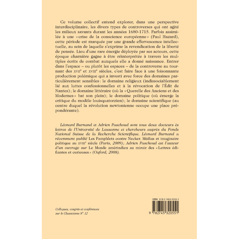 Ce volume collectif entend explorer, dans une perspective interdisciplinaire, les divers types de controverses qui ont agité les milieux savants durant les années 1680-1715. Parfois assimilée à une " crise de la conscience européenne " (Paul Hazard), cette période est marquée par une grande effervescence intellectuelle, au sein de laquelle s'exprime la revendication de la liberté de pensée. Lieu d'une rare énergie déployée par ses acteurs, cette époque charnière gagne à être réinterprétée à travers les multiples écrits de combat auxquels elle a donné naissance. Entrer dans l'espace - ou plutôt les espaces - de la controverse au tournant des XVIIe et XVIIIe siècles, c'est faire face à une foisonnante production polémique qui a investi avec force des domaines particulièrement sensibles : le domaine religieux (indissociablement lié aux luttes confessionnelles et à la révocation de l'Edit de Nantes) ; le domaine littéraire (où la " Querelle des Anciens et des Modernes " bat son plein) ; le domaine politique (où émerge la critique du modèle louisquatorzien) ; le domaine scientifique (au centre duquel la révolution newtonienne occupe une place prépondérante). Léonard Burnand et Adrien Paschoud sont tous deux docteurs ès lettres de l'Université de Lausanne et chercheurs auprès du Fonds National Suisse de la Recherche Scientifique. Léonard Burnand est notamment l'auteur de Necker et l'opinion publique (Honoré Champion, 2004) ; Adrien Paschoud a récemment publié Le monde amérindien au miroir des "Lettres édifiantes et curieuses" (Voltaire Foundation, 2008).