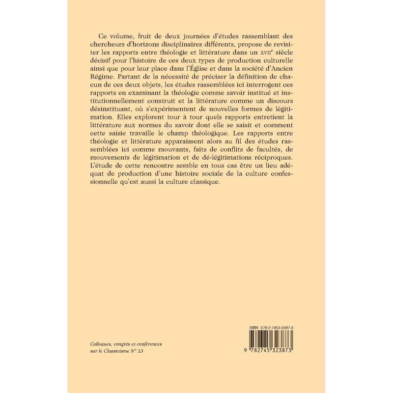 Ce volume, fruit de deux journées d’études rassemblant des chercheurs d’horizons disciplinaires différents, propose de revisiter les rapports entre théologie et littérature dans un XVIIe siècle décisif pour l’histoire de ces deux types de production culturelle ainsi que pour leur place dans l’Église et dans la société d’Ancien Régime. Partant de la nécessité de préciser la définition de chacun de ces deux objets, les études rassemblées ici interrogent ces rapports en examinant la théologie comme savoir institué et institutionnellement construit et la littérature comme un discours désinstituant, où s’expérimentent de nouvelles formes de légitimation. Elles explorent tour à tour quels rapports entretient la littérature aux normes du savoir dont elle se saisit et comment cette saisie travaille le champ théologique. Les rapports entre théologie et littérature apparaissent alors au fil des études rassemblées ici comme mouvants, faits de conflits de facultés, de mouvements de légitimation et de dé-légitimations réciproques. L’étude de cette rencontre semble en tous cas être un lieu adéquat de production d’une histoire sociale de la culture confessionnelle qu’est aussi la culture classique.
