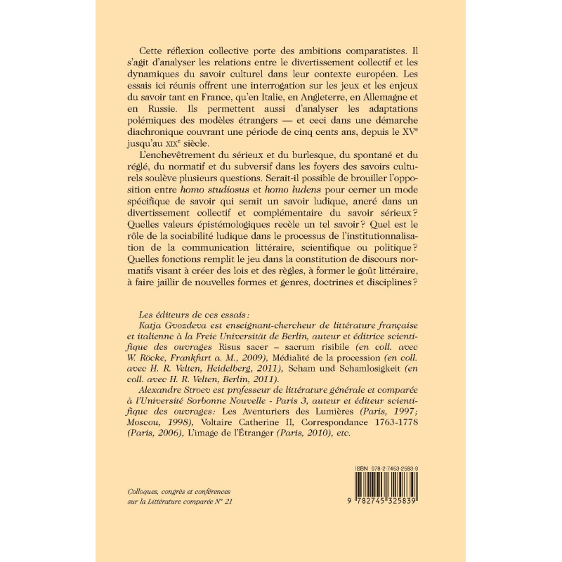 This comparative collection looks at the links between collective entertainment and cultural dynamics in a European context, from the 15th to the 19th century. The distinction between homo studiosus and homo ludens crumbles with the emergence of an alternative, playful mode of knowledge besides the serious one.