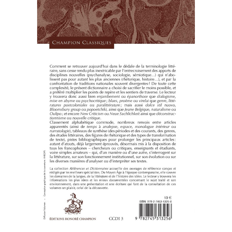 Comment se retrouver aujourd'hui dans le dédale de la terminologie littéraire, sans cesse rendu plus inextricable par l'entrecroisement des apports de disciplines nouvelles (psychanalyse, sociologie, sémiotique…) qui n'abolissent pas pour autant les plus anciennes (rhétorique, histoire…), et par la confrontation de traditions nationales souvent divergentes ? De toute cette complexité, le présent dictionnaire a choisi de sacrifier le moins possible, et a préféré multiplier les points de repère et les sentiers de traverse. Le lecteur y trouvera donc aussi bien enjambement ou épanorthose que dialogisme, mise en abyme ou psychocritique ; blues, proême ou virelai que genre, littératures postcoloniales ou paralittérature ; mais aussi dolce stil nuovo, Bloomsbury group ou popoetchiki, ainsi que Jeune Belgique, naturalisme ou Oulipo ; et encore New Criticism ou Neue Sachlichkeit ainsi que déconstructionnisme ou nouvelle critique. Classement alphabétique commode, nombreux renvois entre articles apparentés (ainsi de temps à analepse, espace, monologue intérieur ou narratologie), tableaux de synthèse (des périodes et des courants, des genres, des études littéraires, des figures de rhétorique et des types de transformation de texte), pistes bibliographiques pour prolonger les principaux articles : autant d'atouts, déjà largement éprouvés, désormais mis à la disposition de tous les francophones - chercheurs ou critiques, enseignants et étudiants, voire simples amateurs - qui, d'un manière ou d'une autre, s'interrogent sur la littérature, sur son fonctionnement institutionnel, sur son évolution ou sur les diverses manières d'analyser ou d'interpréter ses textes.