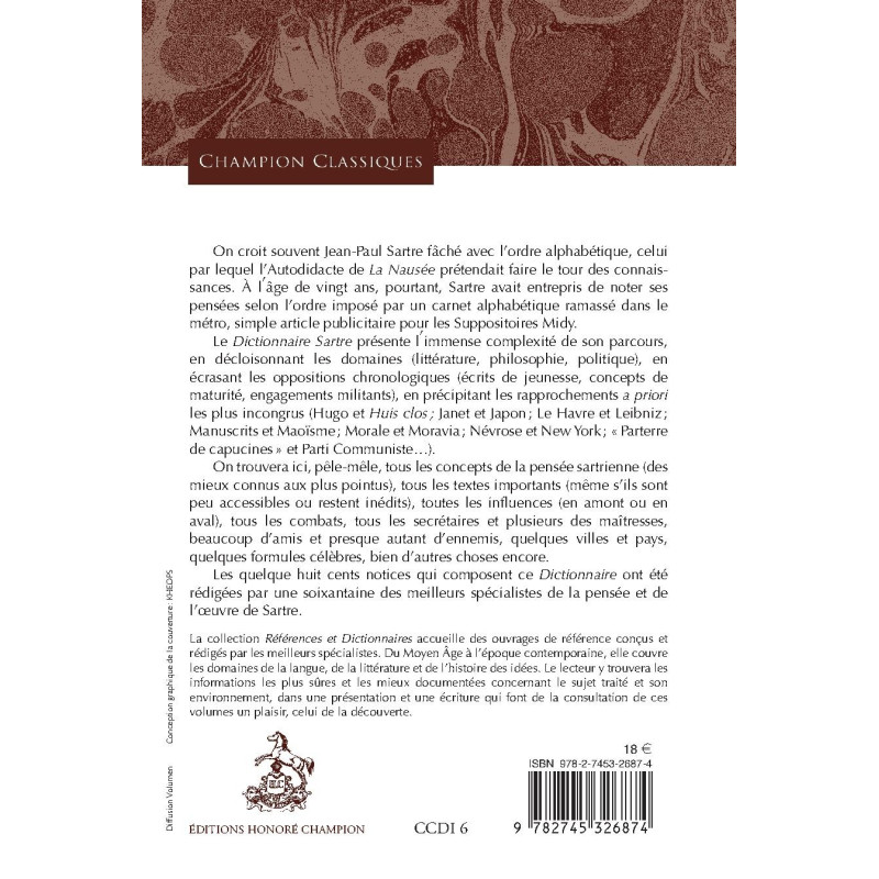 Le Dictionnaire Sartre présente l`immense complexité de son parcours, en décloisonnant les domaines (littérature, philosophie, politique), en écrasant les oppositions chronologiques (écrits de jeunesse, concepts de maturité, engagements militants), en précipitant les rapprochements a priori les plus incongrus (Hugo et Huis clos; Janet et Japon; Le Havre et Leibniz; Manuscrits et Maoïsme; Morale et Moravia; Névrose et New York; "Parterre de capucines" et Parti Communiste…).