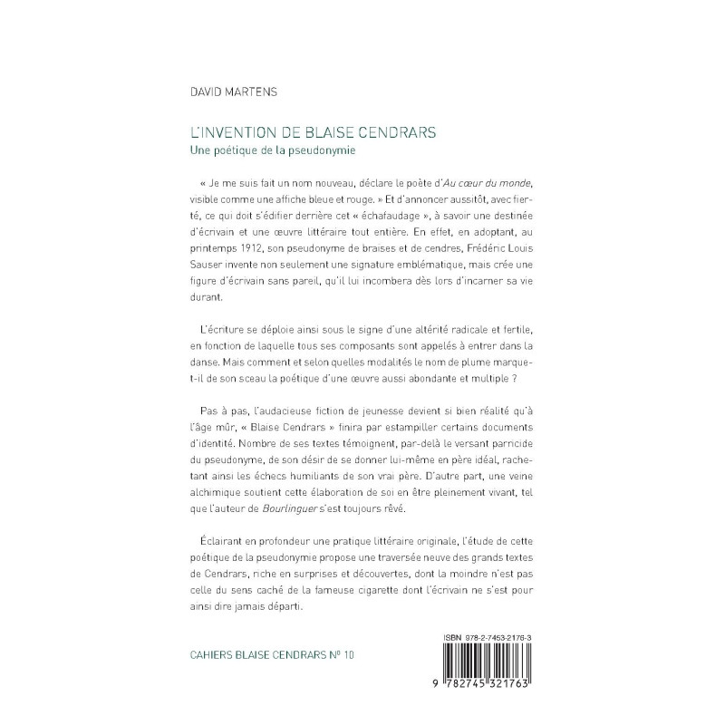 "Je me suis fait un nom nouveau, déclare le poète d'Au coeur du monde, visible comme une affiche bleue et rouge." Et d'annoncer aussitôt, avec fierté, ce qui doit s'édifier derrière cet "échafaudage", à savoir une destinée d'écrivain et une œuvre littéraire toute entière. En effet, en adoptant, au printemps 1912, son pseudonyme de braises et de cendres, Frédéric Louis Sauser invente non seulement une signature emblématique, mais crée une figure d'écrivain sans pareil, qu'il lui incombera dès lors d'incarner sa vie durant. L'écriture se déploie ainsi sous le signe d'une altérité radicale et fertile, en fonction de laquelle tous ses composants sont appelés à entrer dans la danse. Mais comment et selon quelles modalités le nom de plume marque-t-il d e son sceau la poétique d'une œuvre aussi abondante et multiple ? Pas à pas, l'audacieuse fiction de jeunesse devient si bien réalité qu'à l'âge mûr, "Blaise Cendrars" finira par estampiller certains documents d'identité. Nombre de ses textes témoignent, par-delà le versant parricide du pseudonyme, de son désir de se donner lui-même en père idéal, rachetant ainsi les échecs hu miliants de son vrai père. D'autre part, une veine alchimique soutient cette élaboration de soi en être pleinement vivant, tel que l'auteur de Bourlinguer s'est toujours rêvé. Éclairant en profondeur une pratique littéraire originale, l'étude de cette poétique de la pseudonymie propose une traversée neuve des grands textes de Cendrars, riche en surprises et découvertes, dont la moindre n'est pas celle du sens caché de la fameuse cigarette dont l'écrivain ne s'est pour ainsi dire jamais départi.